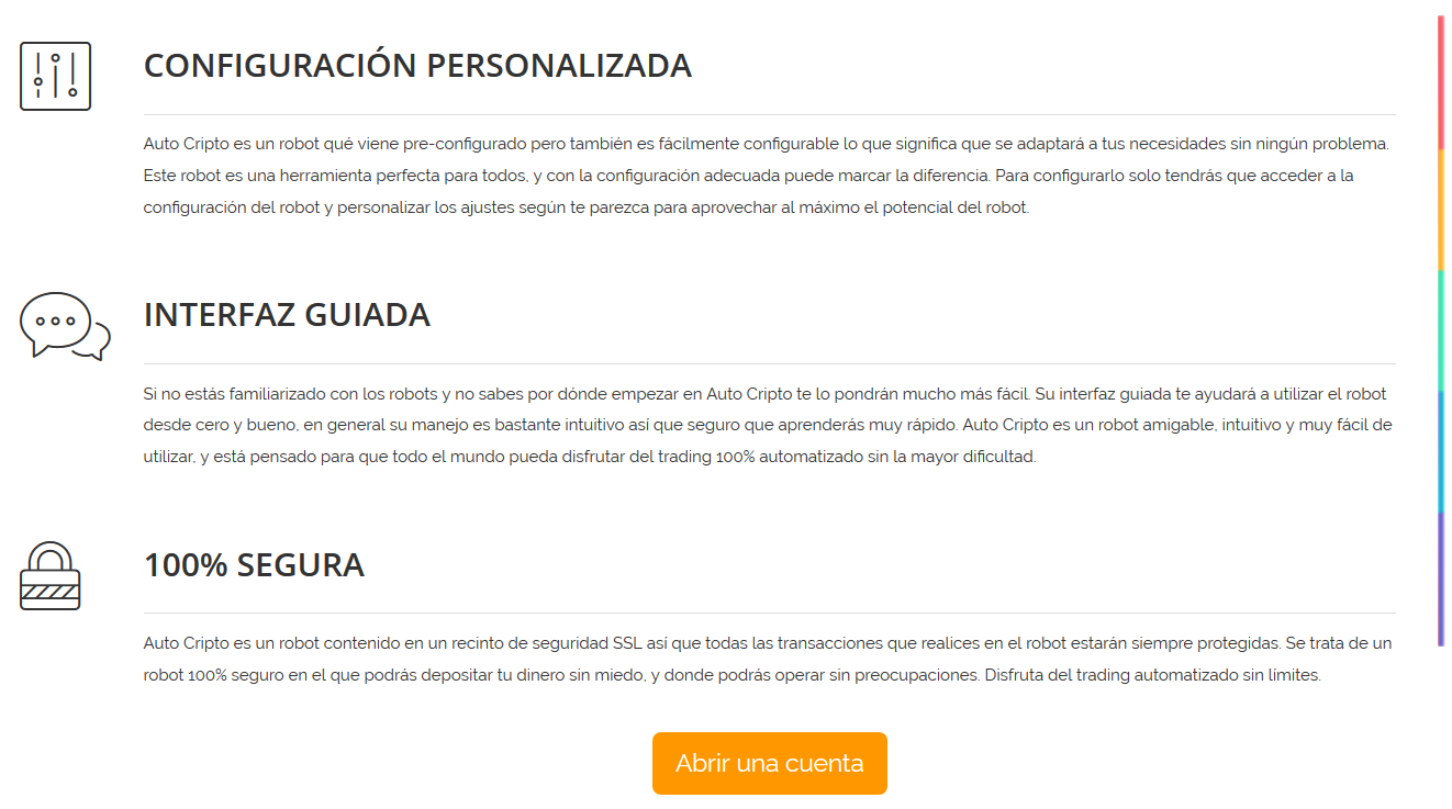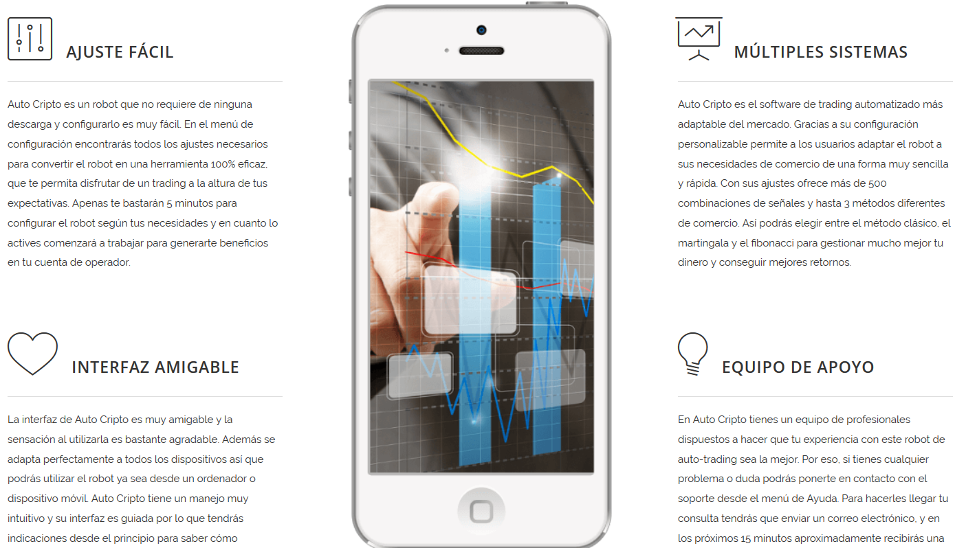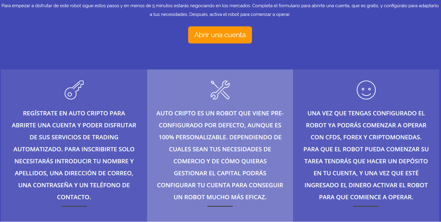 Destacaremos de Auto Cripto que es un robot que ha sido desarrollado por profesionales para que tú también puedas disfrutar del éxito en el trading con CFDs, Forex y criptomonedas, con independencia de los conocimientos y experiencia previa que tengas en estas operaciones.