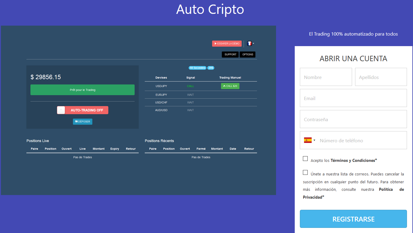 En cuestión de 5 minutos ya estarás preparado para disfrutar de todo lo que Auto Cripto tiene que ofrecerte. ¿A qué estás esperando? ¡Regístrate hoy mismo! Además, ¡es gratis!